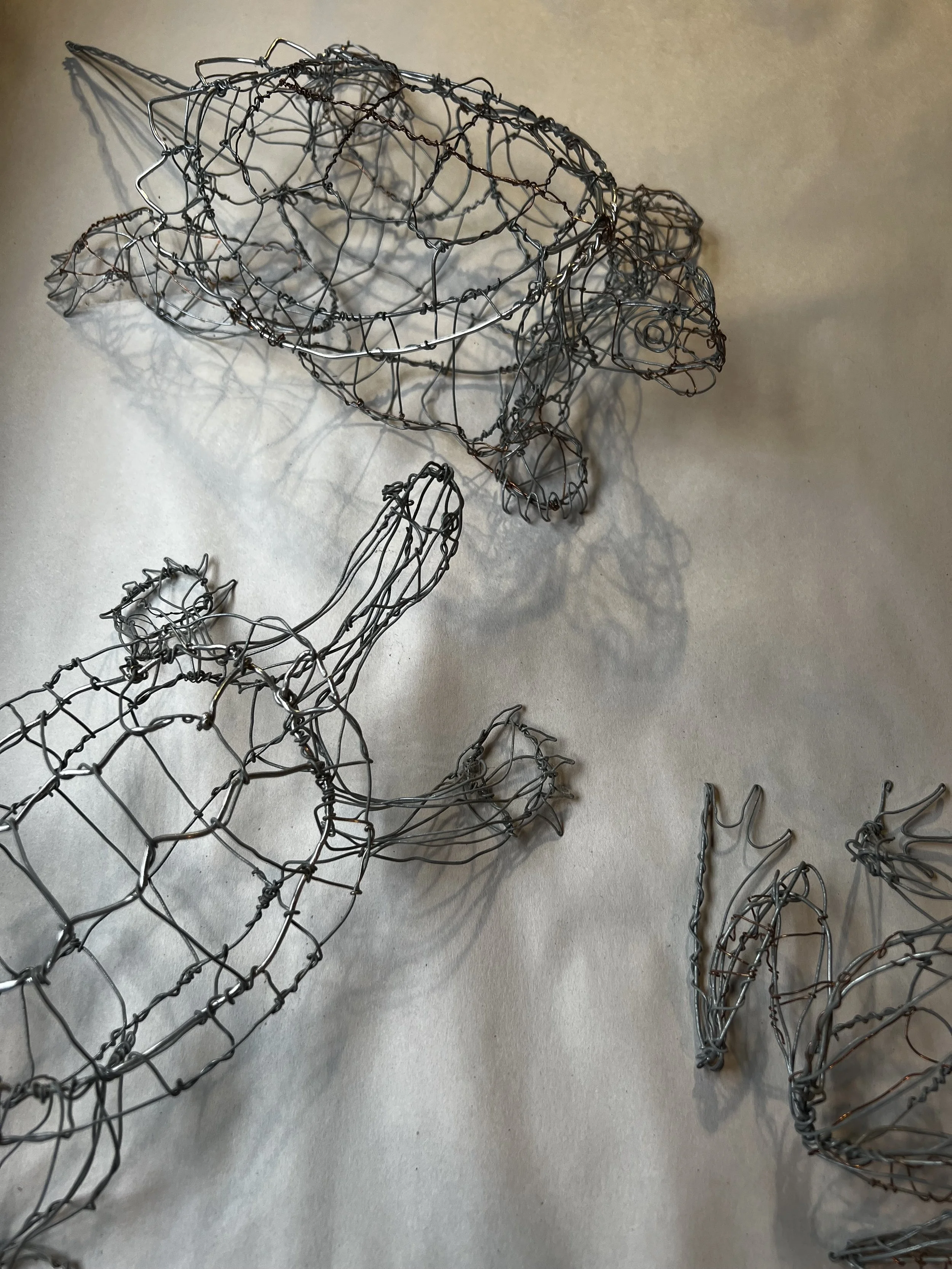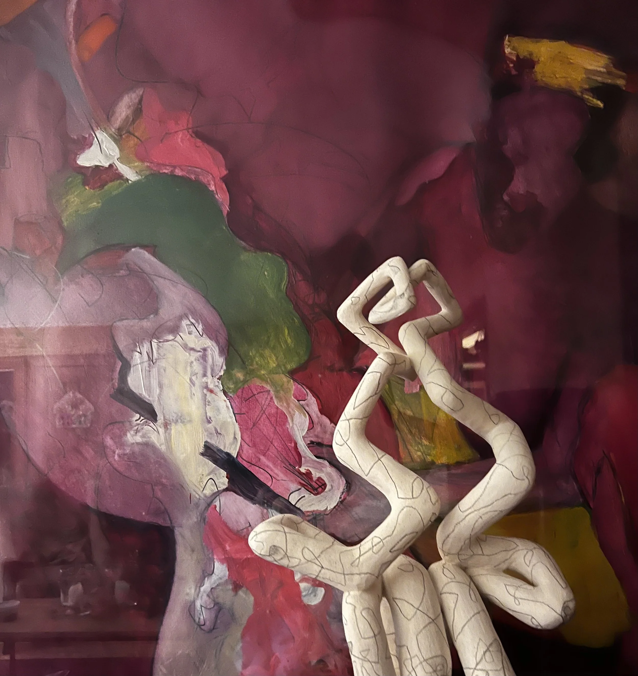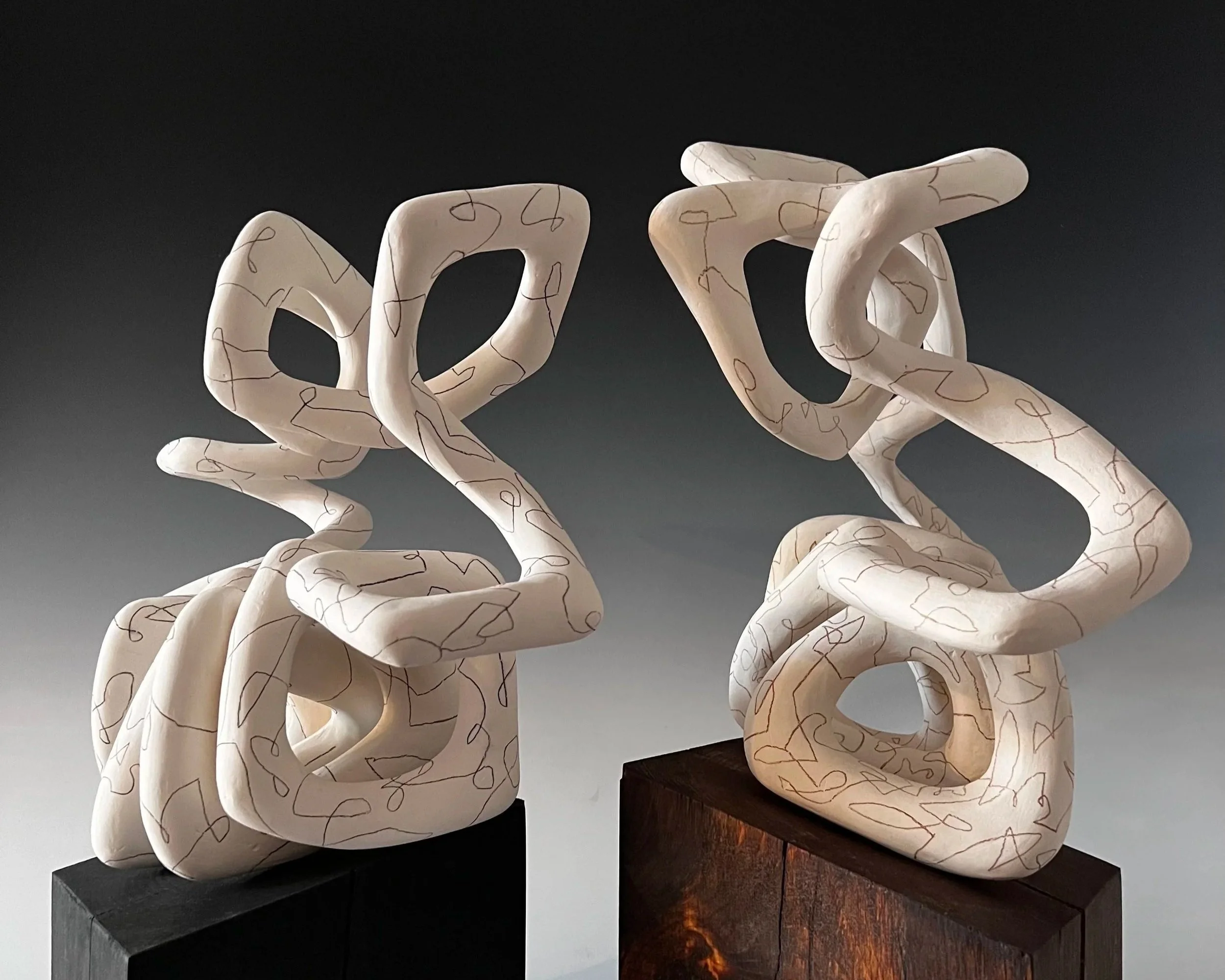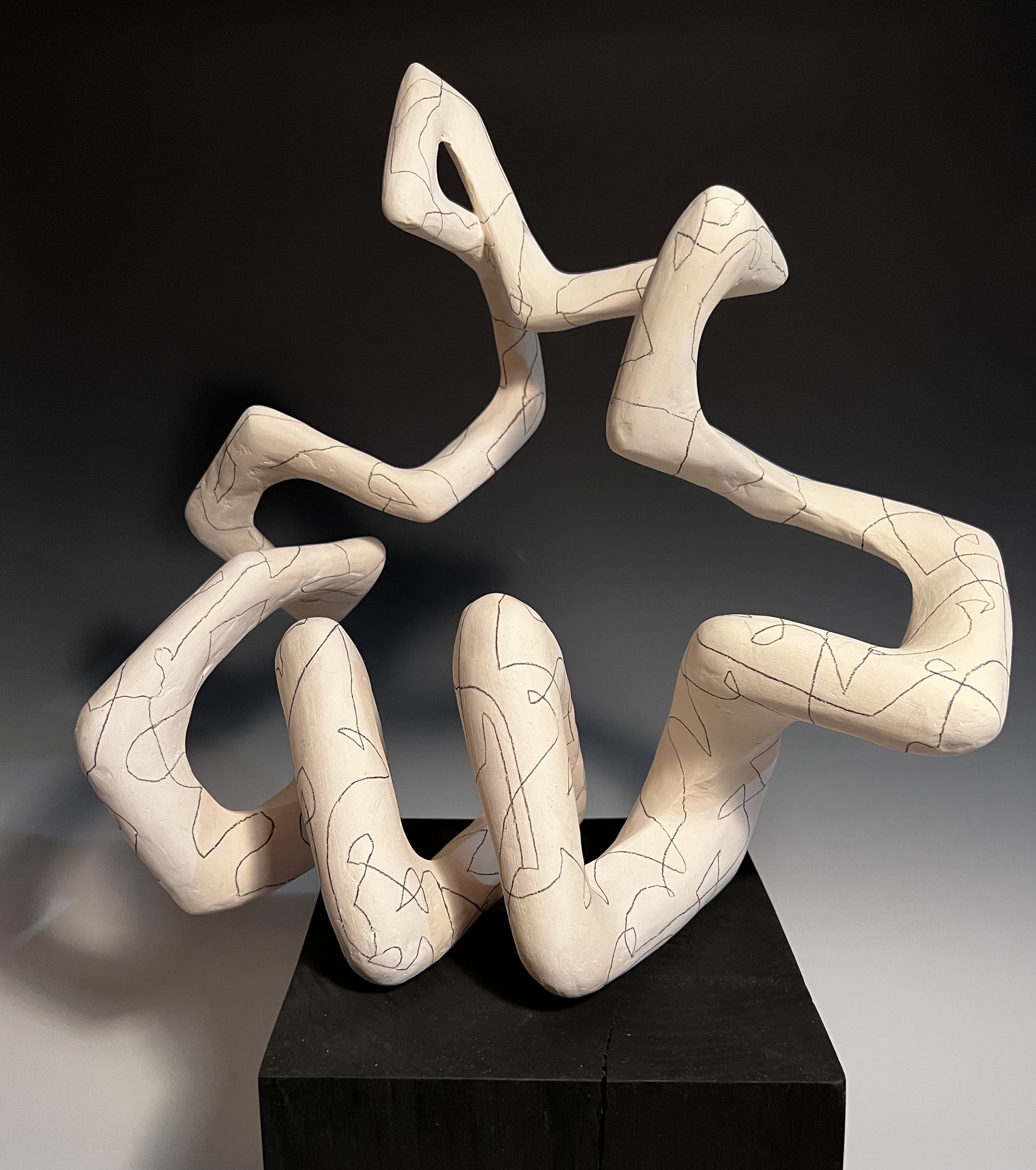 The glaze pencil lines on the surface of the twisting forms of the pieces from the Scribble Series provide a link between my clay work and my work in drawing, painting, and wire sculpture.